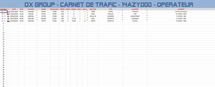 *** Insérez dans votre Carnet de Trafic, Indicatif, Nom, Date, Heure, Fréquence, Mode, Signal, Code Postal, Ville, Pays, Adresse, Envoi et Réception de (E)QSL. ***
